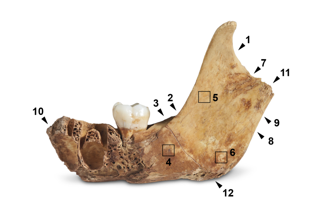 Mandíbula de niño de 7-8 años con distintas marcas en su superficie.