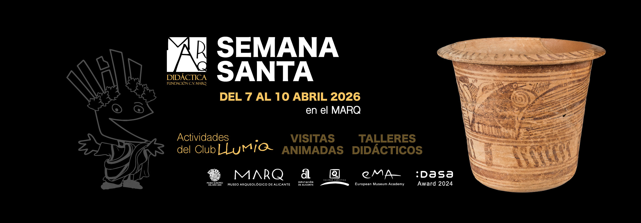 El programa de actividades de la Fundación CV MARQ para las vacaciones escolares de Semana Santa de 2026 comprende visitas guiadas por la exposición permanente del museo y talleres didácticos relacionados con la temática trabajada en cada una de las jornadas. Los participantes serán conducidos por los monitores del Club Llumiq, que explicarán los contenidos de las salas del museo de forma amena, despertando la curiosidad y fomentando la creatividad del grupo de cara a las reproducciones de las piezas arqueológicas que realizarán a continuación en el aula didáctica.